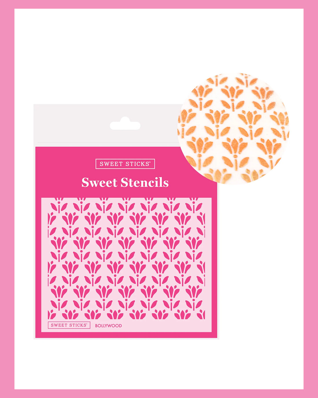 Sweet Sticks stencils are designed to make cake and cookie decorating easy. Our easy Paint & Dust with Zero Fuss stencil art application method will not only have your desserts stand out from the crowd, you’ll also get your orders out in no time as this method is so quick and easy. For Cupcake Application: 1. Cut sheet of parchment paper to the same size as stencil. Place sheet of parchment paper on a flat surface and place stencil on top. 2. Pipe desired amount of buttercream in the centre of your cupcake. 3. Flip upside down and press against stencil to flatten the buttercream. Place all in fridge to set. 4. Once set, remove parchment paper and apply thin coat of Alcohol Free Activator over stencil. 5. Gently apply Lustre with Lustre Brush over the top. Brush away excess dust. 6. Slowly peel stencil. For Fondant Application: 1. Roll out fondant to desired thickness. 2. Place stencil over your fondant, slowly continue to roll until imprint of stencil is on fondant. 3. Apply a thin coat of Alcohol Free Activator over your stencil. 4. Gently apply Lustre with Lustre Brush over the top. Brush away excess dust. 5. Slowly peel stencil. Our Sweet Stencils can also be used for other methods such as: airbrushing, royal icing techniques, buttercream and ganache applications. Stencil measures 140mm x 140mm Inside design measures 120mm x 120mm Stencils are made with 10mil Food Grade Mylar. Stencils are washable and reusable. Care Instructions: Gently wash in warm soapy water and lay flat to dry. Do not put in dishwasher.