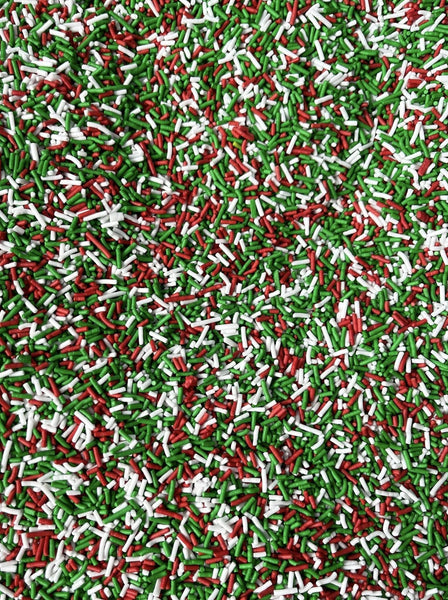 This festive mix of Christmas Crunchy Sprinkles features a playful blend of red, green, and white jimmies, combined with coveted skinny sugar strands with the perfect sweetness and crunch. Made in Canada.