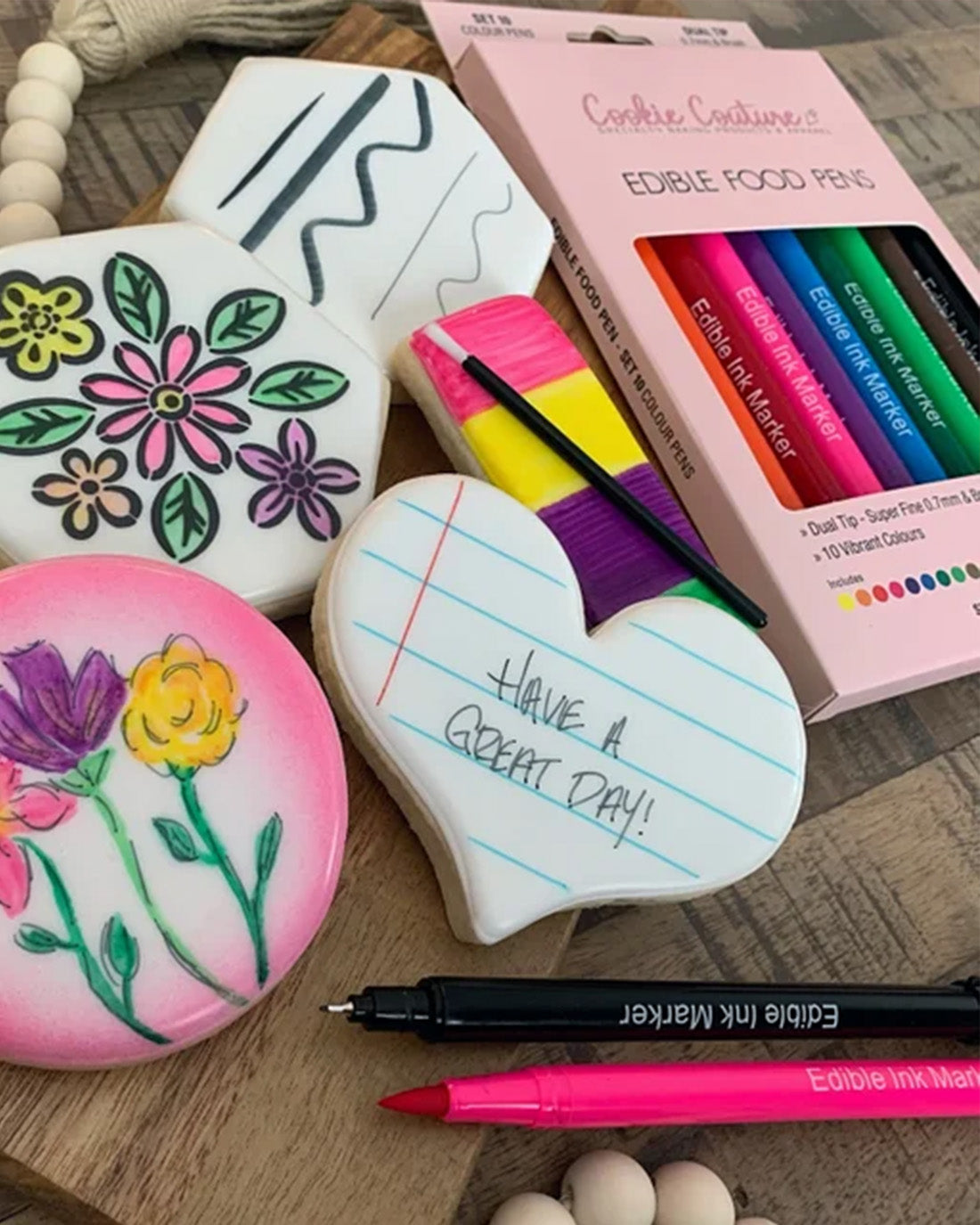These COOKIE COUTURE 0.7mm super fine tip & brush pens come in 10 vibrant colours! Dress up your cookies, cakes, macarons, meringue and more. Ensure the surface of the icing or baked good is fully dry prior to use. Cookie Couture Edible Markers are 100% food safe, made with FDA compliant food colouring and ingredients. Great for details, drawing and can even be used as paint by adding a small amount of water once applied to the surface of your sugar work! Nut, peanut & gluten free, vegan friendly.