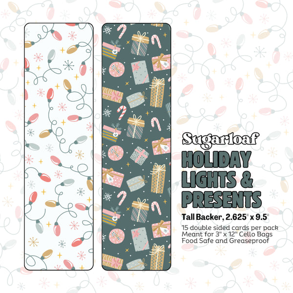 9.5″ x 2.625″ (Approx 24.5cm x 7.1cm) Tall Backers for Cookies or other small treats in “Holiday Lights” Pattern with “Presents” on the opposite side.
