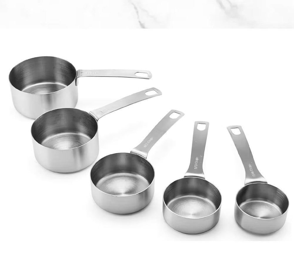 Heavy-gauge satin brushed stainless steel cups and spoons are strong and rust-resistant.