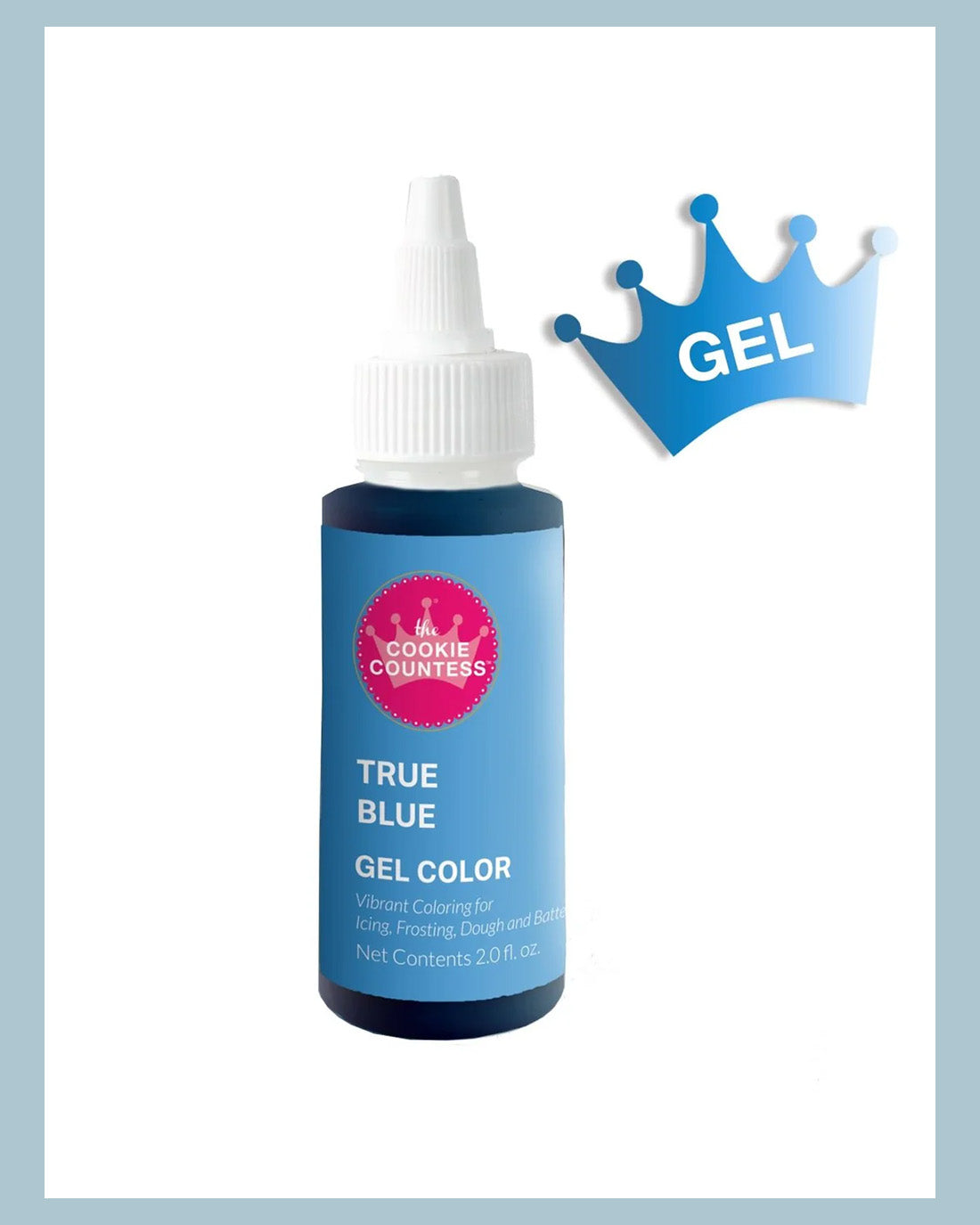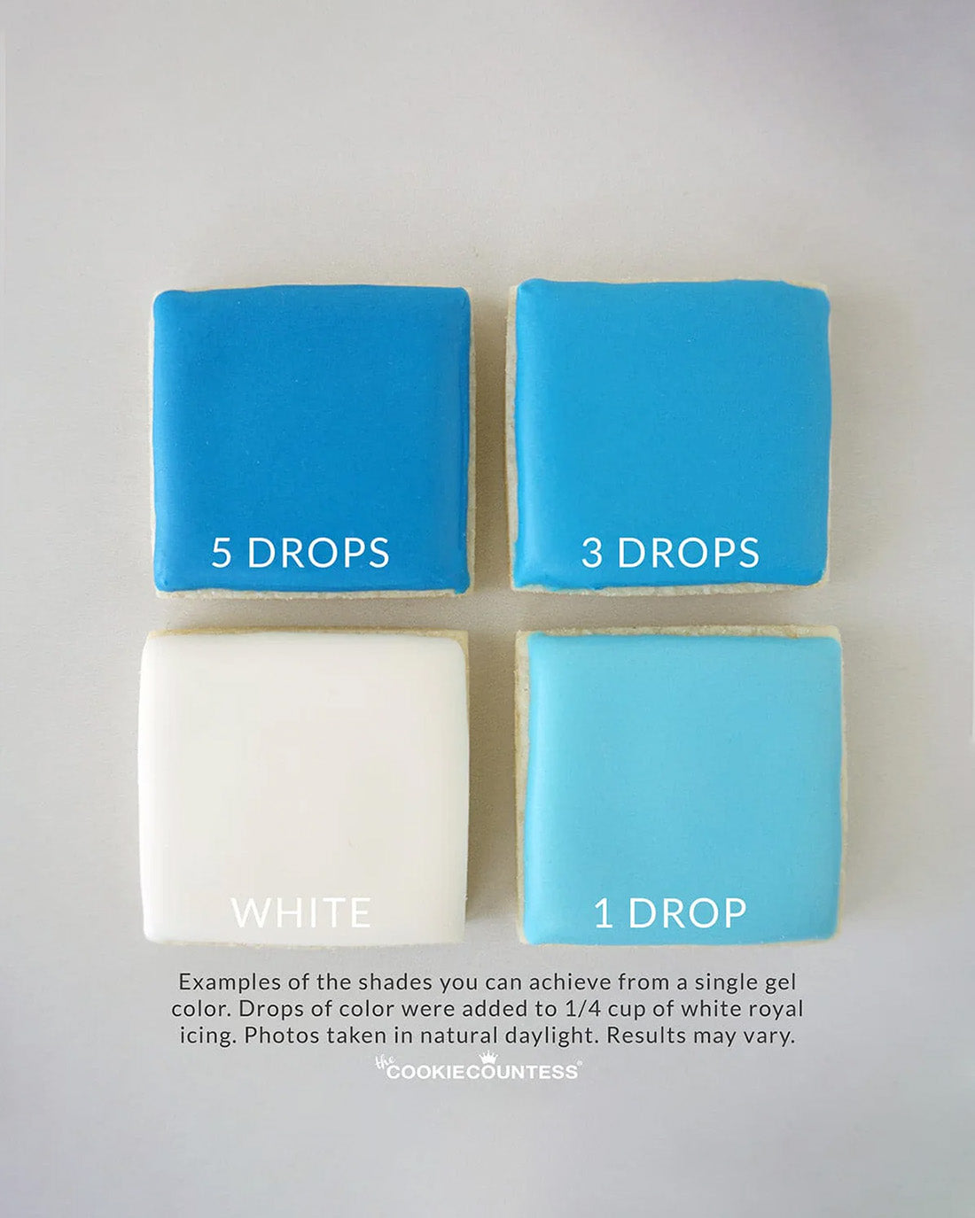 Cookie Countess Gel Colors are highly concentrated and provide vibrant color with less liquid. They are formulated to match our airbrush colors. But also have fun experimenting by using a pinch of these colors to create softer hues.