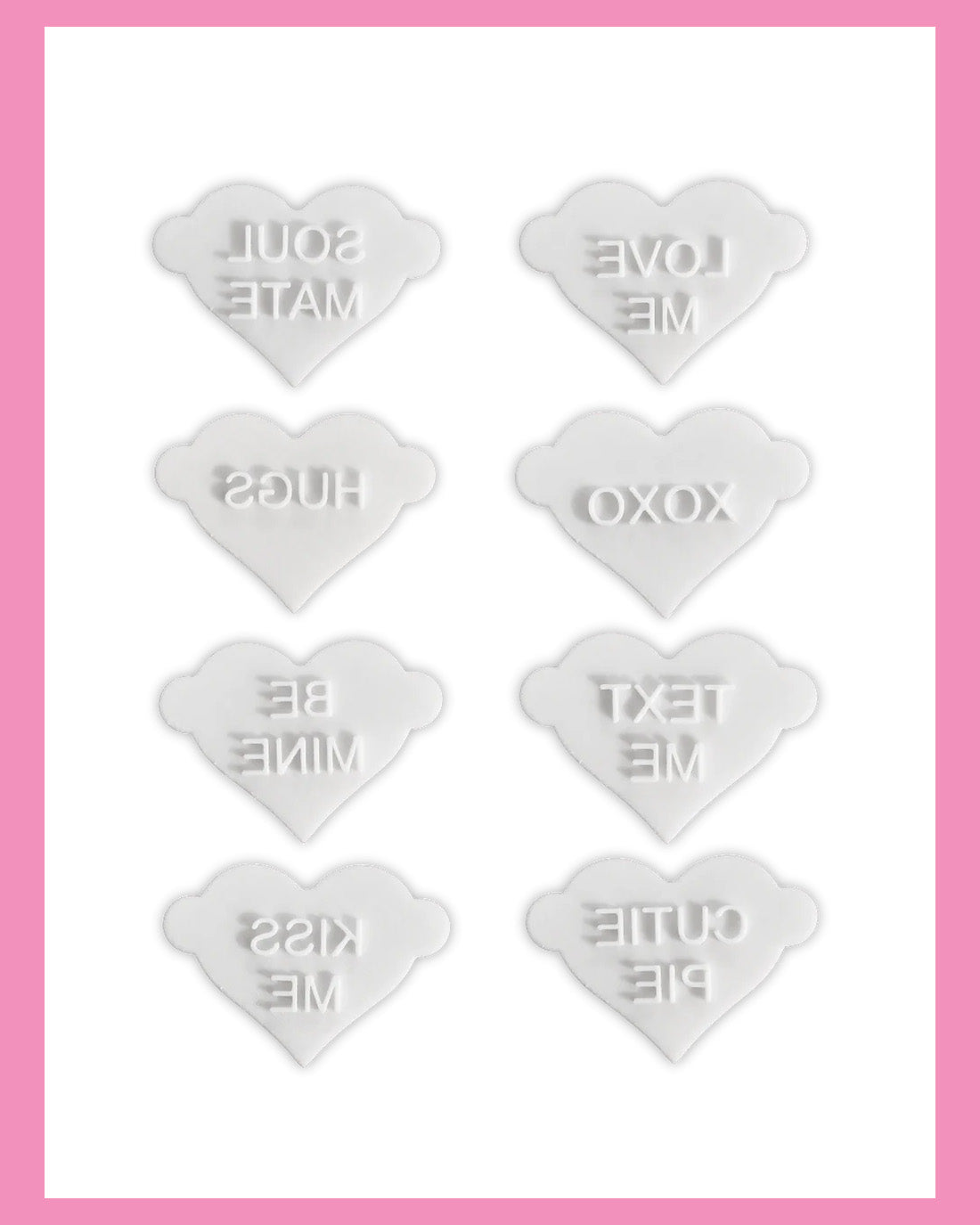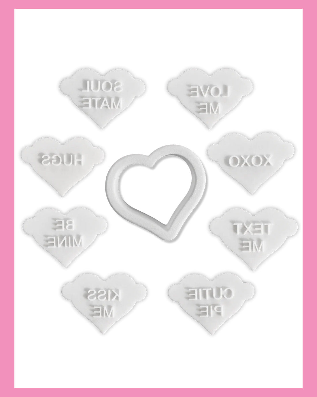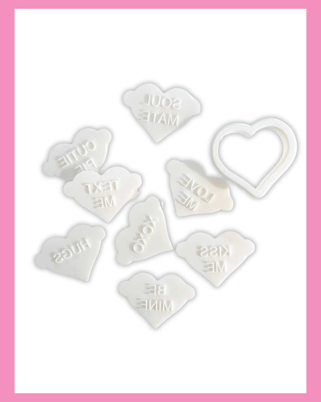 Mini Conversation Heart Cookie Cutter and Stamps Spread the love with these mini cookie cutter and stamps! Perfect for Valentines or to tell that special someone just how you feel. Stamps can be used with cookie dough, or fondant. To use on your cookies, stamp into the dough BEFORE you bake. Coloring your dough and using (sold seperately) make easy conversation heart cookies! Read the full tutorial here! Cutter and Stamps Measures 2" X 2" Stamp Sayings: