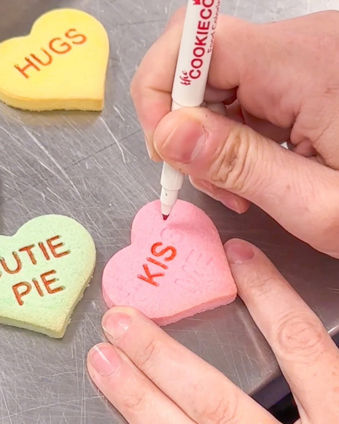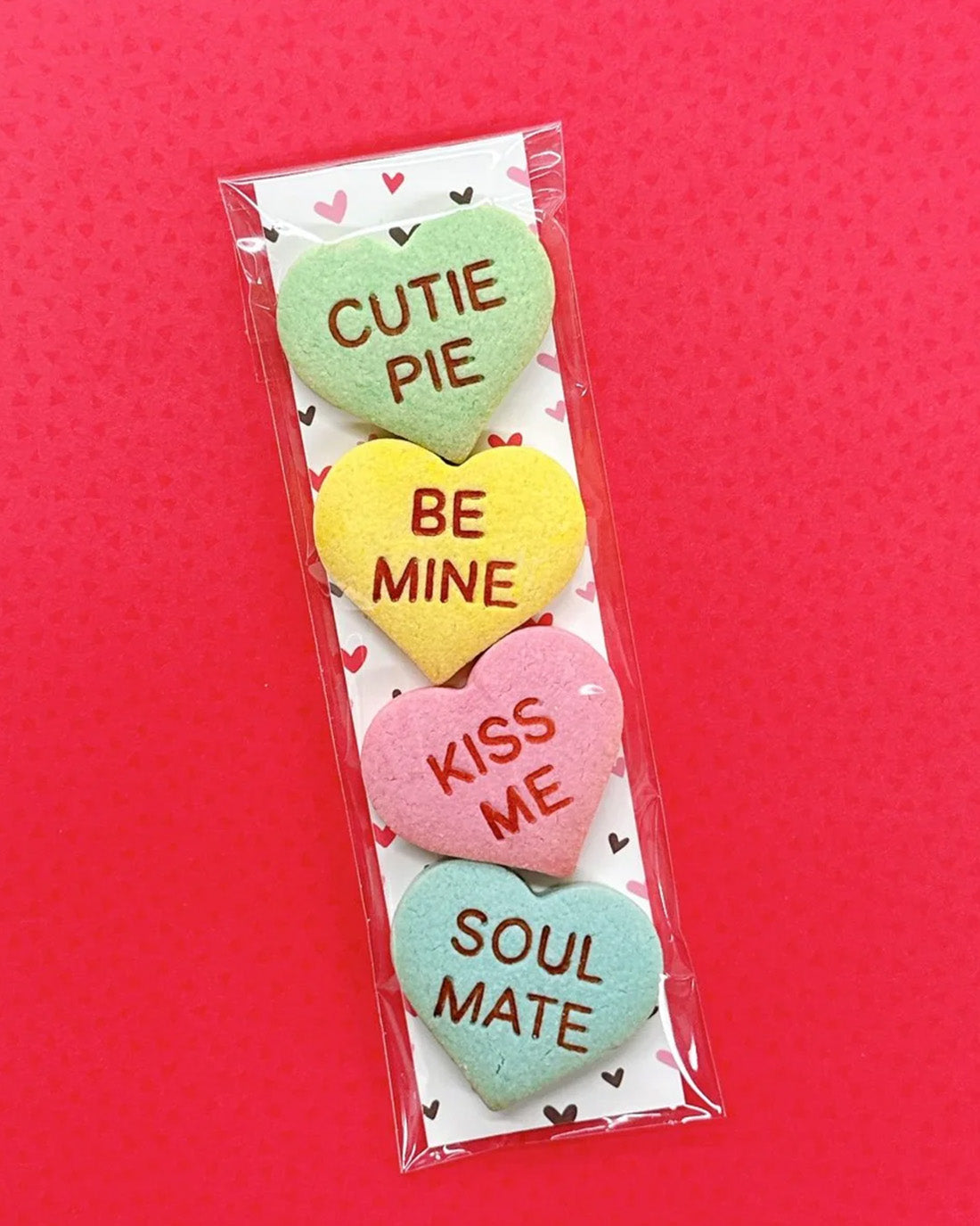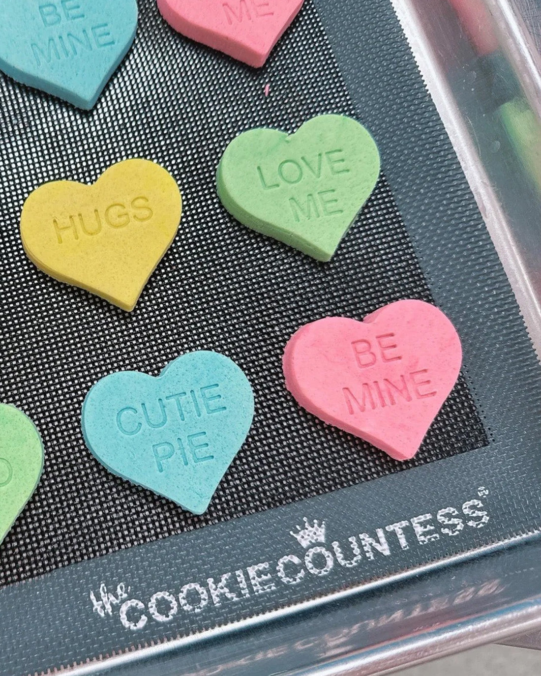 Mini Conversation Heart Cookie Cutter and Stamps Spread the love with these mini cookie cutter and stamps! Perfect for Valentines or to tell that special someone just how you feel. Stamps can be used with cookie dough, or fondant. To use on your cookies, stamp into the dough BEFORE you bake. Coloring your dough and using (sold seperately) make easy conversation heart cookies! Read the full tutorial here! Cutter and Stamps Measures 2" X 2" Stamp Sayings: