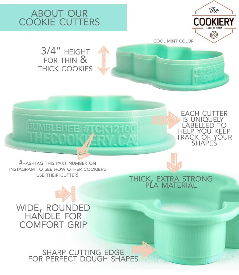 ABOUT  THE COOKIERY COOKIE CUTTERS: We use only the best PLA filaments that are 100% food safe and biodegradable. Our filament is stronger than standard PLA material. All our cutters come in a pastel green color as pictured and lovingly packaged and shipped with care. Each cutter has a wide grip on top for easy handling and dough cutting, and a sharp cutting edge to ensure nice clean edges for your cookies. All cutters are made to order, we only print as you order from us and do not keep any in stock. This is to ensure we are able to give your cutters the best attention as they are made, just for you!