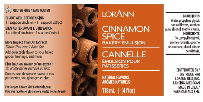 Use LorAnn's Cinnamon Spice baking and flavoring emulsion in cakes, puddings, muffins, cookies, sweet breads and frosting for a delicious kick of rich cinnamon flavor.