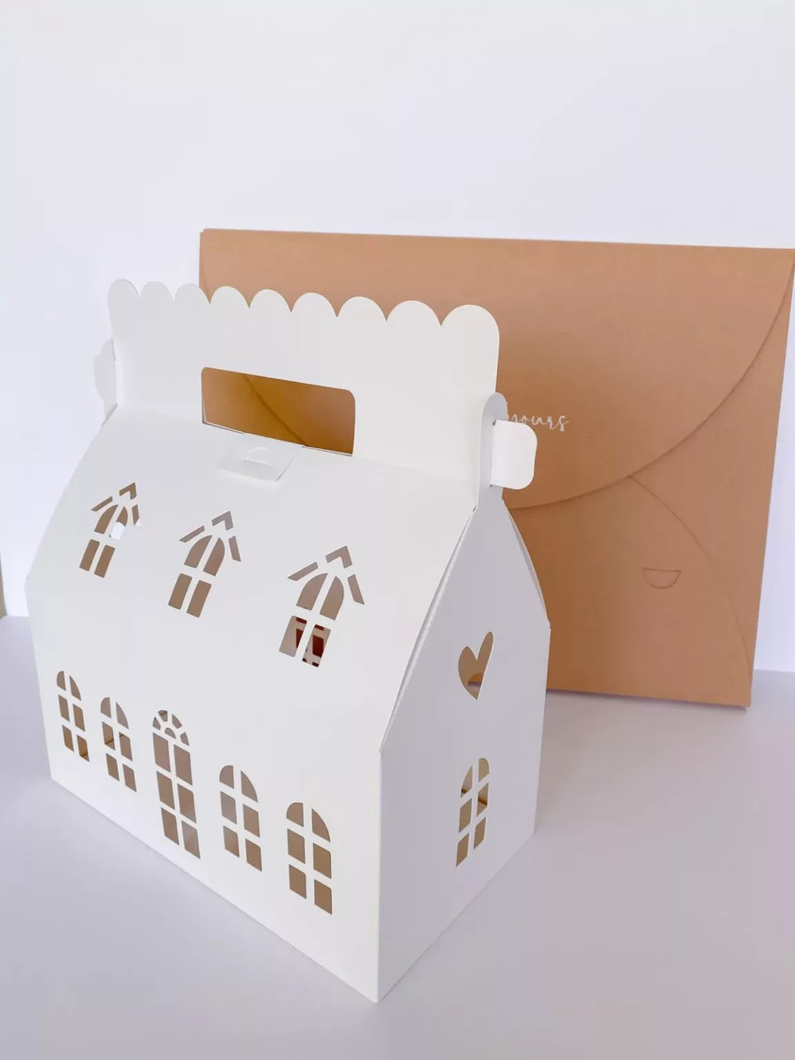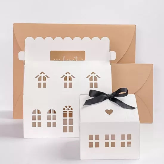 • PREMIUM PAPERBOARD material. Each pastry gift box is 10.5” x 5.5” x 9.5” inches tall with its gable. 10 baking boxes for cookies and cupcakes and biscuits and – the list is long. Each box has detailed laser cutout doors and windows for extra wow!