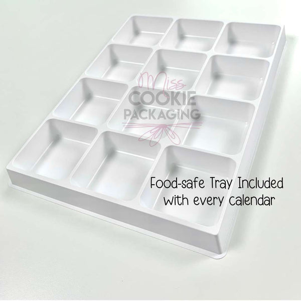 The calendar opens like a book and has 12 numbered perforated doors. There is an opening on the top and bottom of the calendar, this is where the white internal tray is inserted into the box. You will need to heat seal all of your cookies, place them into the white trays and place the white trays inside the calendar box. The internal white tray is made from a food-safe material but heat sealing your cookies is recommended for optimum freshness.