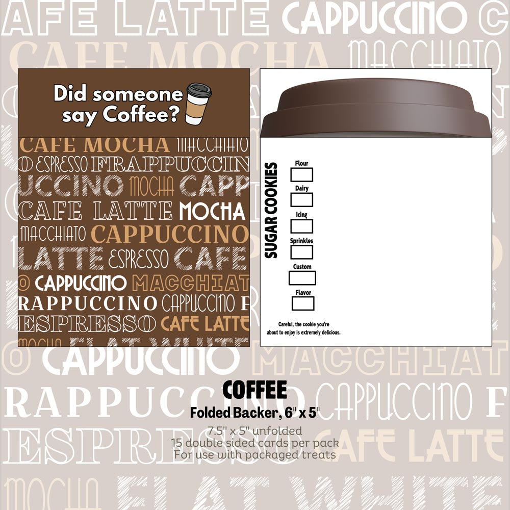 Coffee Words design by Caspers Wierd Nest Cookie Coffee Cup Customization by SLMD These beautifully printed backers are coated so that they can be used with food products, however, are not meant for direct contact with food due to the colored printing. Please ensure that food is wrapped in cello packaging when placed on the card.