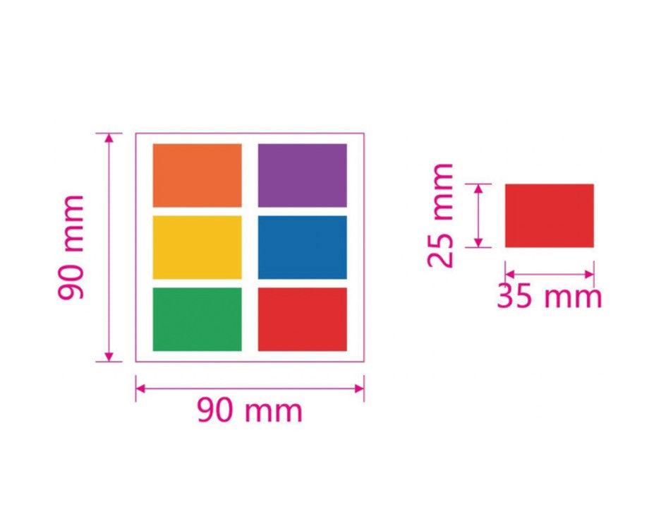 • Each palette is 3.5” x 3.5” with coloured rectangles measuring 1 x 1.4" with a 2 year shelf life.