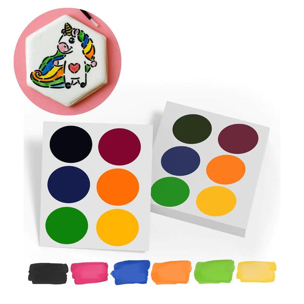 Palettes come 6 to a pouch. Palettes of edible paint, that works just like watercolors. You can use these palettes with our PYO (Paint Your Own) cookie designs, or simply as a fun and creative way to paint a blank cookie covered in royal icing. Edible paint in 6 colors (colors appear darker than final result) - Yellow, Orange, Red, Green, Blue and Black