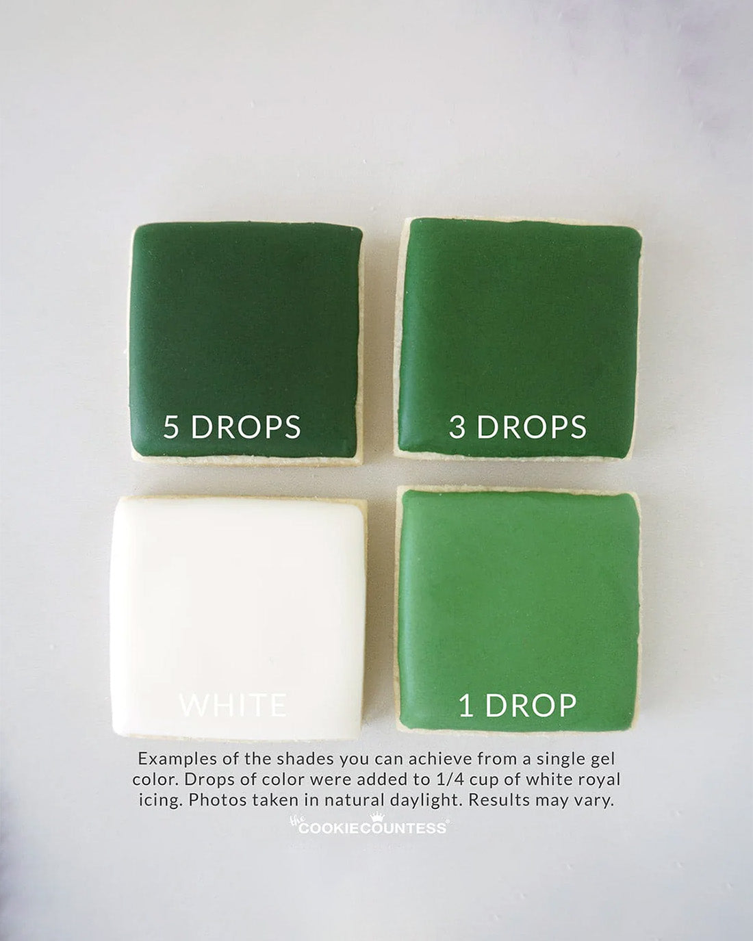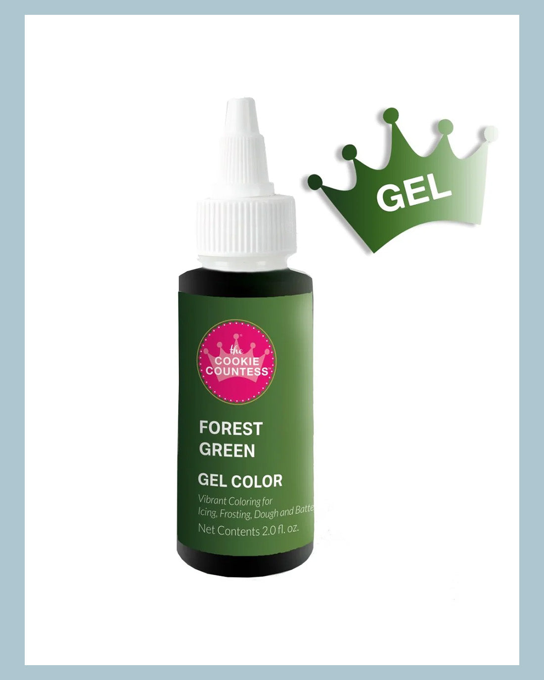 Forest Green is from our collection of Rustic Colors. It's a rich, dark pink green. Cookie Countess Gel Colors are highly concentrated and provide vibrant color with less liquid. Have fun experimenting by using a pinch of these colors to create softer hues.