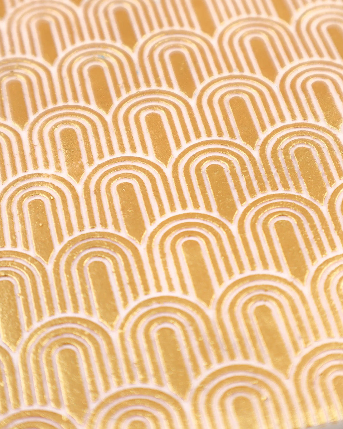 For Cupcake Application: 1. Cut sheet of parchment paper to the same size as stencil. Place sheet of parchment paper on a flat surface and place stencil on top. 2. Pipe desired amount of buttercream in the centre of your cupcake. 3. Flip upside down and press against stencil to flatten the buttercream. Place all in fridge to set. 4. Once set, remove parchment paper and apply thin coat of Alcohol Free Activator over stencil. 5. Gently apply lustre with lustre brush over the top. Brush away excess dust. 6. Slowly peel stencil.