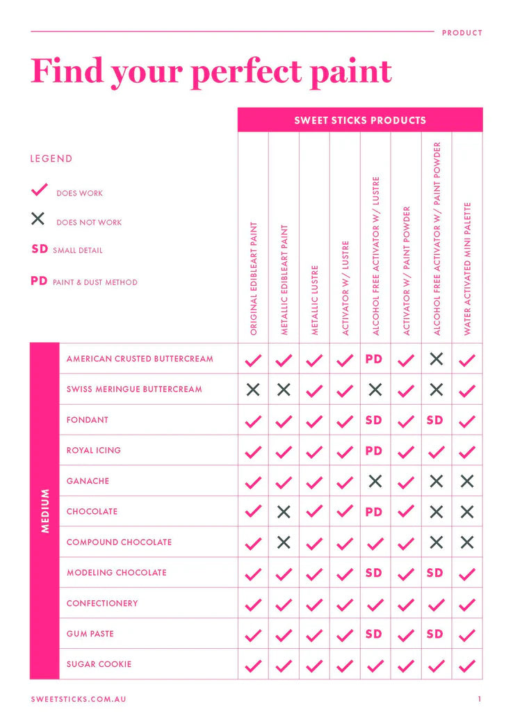 Activate, Stir and Paint with SWEET STICKS Water Activated Metallic Food Paint! A revolutionary way to decorate your cakes, desserts and cookies.