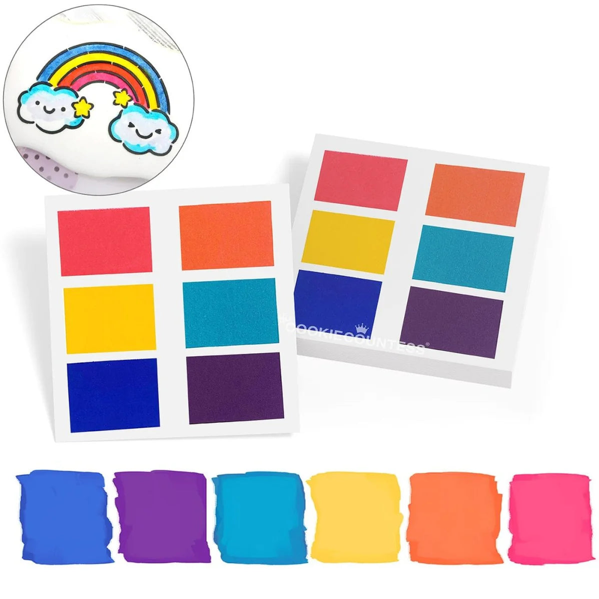 Palettes of edible paint, that works just like watercolors. You can use these palettes with our PYO (Paint Your Own) cookie designs, or simply as a fun and creative way to paint a blank cookie covered in royal icing. Edible paint in 6 colors (colors appear darker than final result) - dark blue, purple, light blue, yellow, orange, and pink.