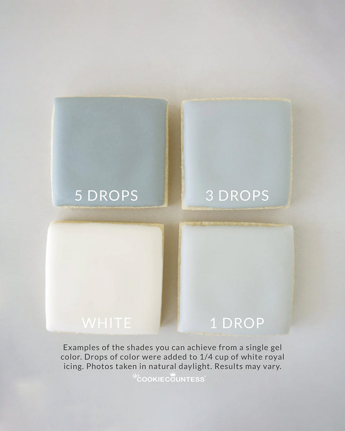 Something Blue is a muted warm blue from our Wedding Colors collection. Cookie Countess Gel Colors are highly concentrated and provide vibrant color with less liquid. Have fun experimenting by using a pinch of these colors to create softer hues.