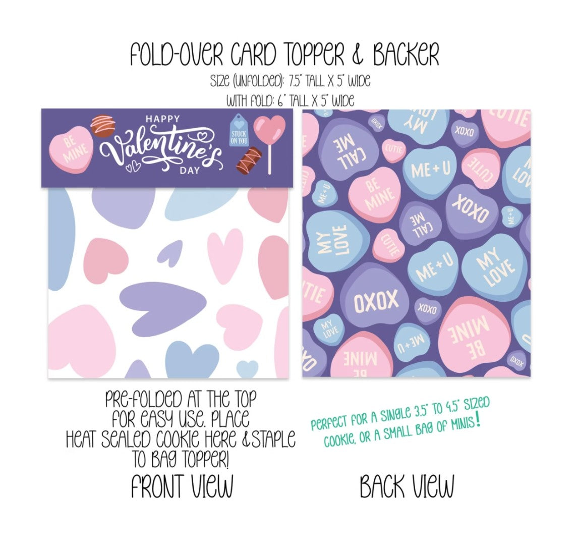 Made of top quality, thick, coated, food-safe cards, these are the perfect toppers for single cookies or a small bag of mini cookies! Simply staple your heat sealed cookie to the pre-folded bag topper at the top, and the long card provides a cute and sturdy background for your cookie. No box or bows required! There are printed designs on both the front and back of each card.
